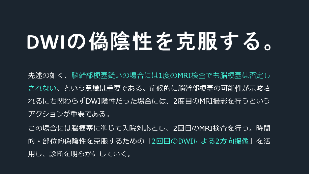 この場合には脳梗塞に準じて入院対応とし、2回目のMRI検査を行う。時間的・部位的偽陰性を克服するための「2回目のDWIによる2方向撮像」を活用し、診断を明らかにしていく。 DWIの偽陰性を克服する。