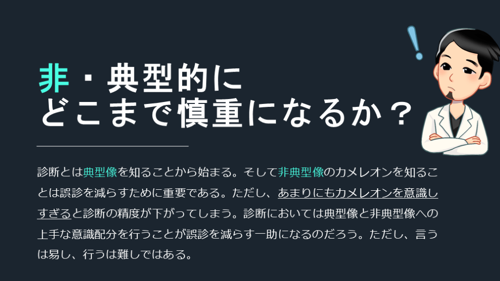 どこまで慎重になるか? 診断とは典型像を知ることから始まる。そして非典型像のカメレオンを知ることは誤診を減らすために重要である。ただし、あまりにもカメレオンを意識しすぎると診断の精度が下がってしまう。診断においては典型像と非典型像への上手な意識配分を行うことが誤診を減らす一助になるのだろう。ただし、言うは易し、行うは難しではある。
