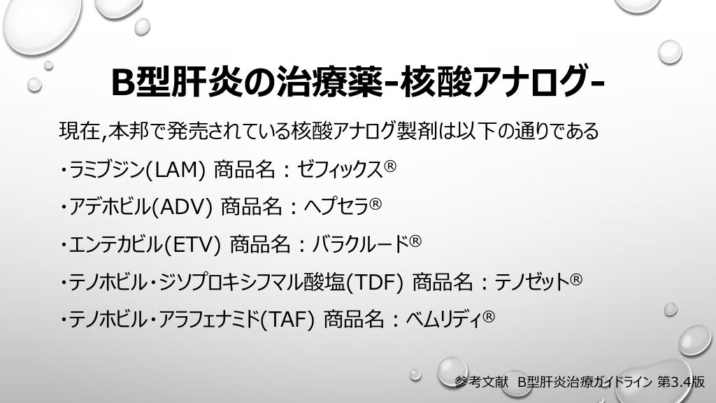 #10. B型肝炎の治療薬-核酸アナログ現在,本邦で発売されている核酸アナログ製剤は以下の通りである ・ラミブジン(LAM) 商品名︓ゼフィックス® ・アデホビル(ADV) 商品名︓ヘプセラ® ・エンテカビル(ETV) 商品名︓バラクルード® ・テノホビル・ジソプロキシフマル酸塩(TDF) 商品名︓テノゼット® ・テノホビル・アラフェナミド(TAF) 商品名︓ベムリディ® 参考⽂献 B型肝炎治療ガイドライン 第3.4版