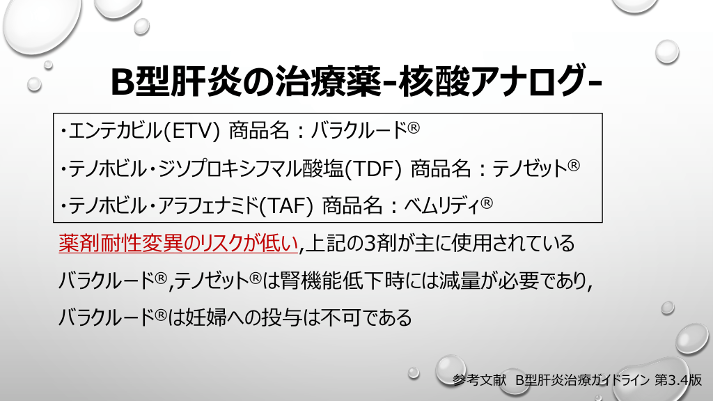 #11. B型肝炎の治療薬-核酸アナログ・エンテカビル(ETV) 商品名︓バラクルード® ・テノホビル・ジソプロキシフマル酸塩(TDF) 商品名︓テノゼット® ・テノホビル・アラフェナミド(TAF) 商品名︓ベムリディ® 薬剤耐性変異のリスクが低い,上記の3剤が主に使⽤されている バラクルード®,テノゼット®は腎機能低下時には減量が必要であり, バラクルード®は妊婦への投与は不可である 参考⽂献 B型肝炎治療ガイドライン 第3.4版