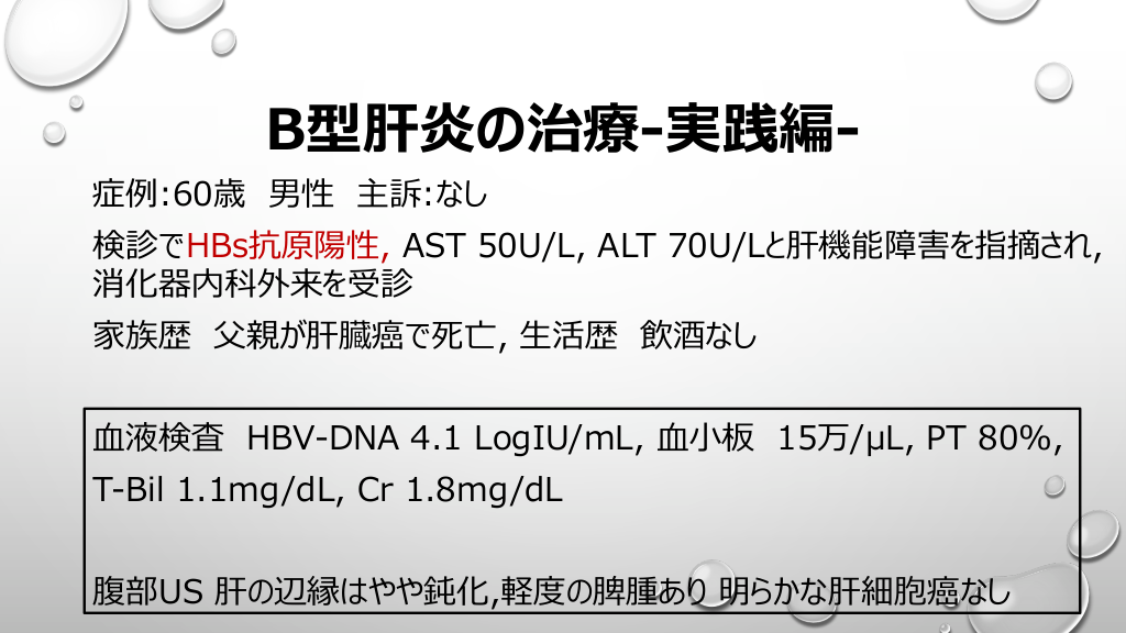#12. B型肝炎の治療-実践編症例:60歳 男性 主訴:なし 検診でHBs抗原陽性, AST 50U/L, ALT 70U/Lと肝機能障害を指摘され, 消化器内科外来を受診 家族歴 ⽗親が肝臓癌で死亡, ⽣活歴 飲酒なし ⾎液検査 HBV-DNA 4.1 LogIU/mL, ⾎⼩板 15万/μL, PT 80%, T-Bil 1.1mg/dL, Cr 1.8mg/dL 腹部US 肝の辺縁はやや鈍化,軽度の脾腫あり 明らかな肝細胞癌なし