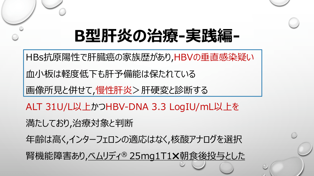 #13. B型肝炎の治療-実践編HBs抗原陽性で肝臓癌の家族歴があり,HBVの垂直感染疑い ⾎⼩板は軽度低下も肝予備能は保たれている 画像所⾒と併せて,慢性肝炎>肝硬変と診断する ALT 31U/L以上かつHBV-DNA 3.3 LogIU/mL以上を 満たしており,治療対象と判断 年齢は⾼く,インターフェロンの適応はなく,核酸アナログを選択 腎機能障害あり,ベムリディ® 25mg1T1✖朝⾷後投与とした
