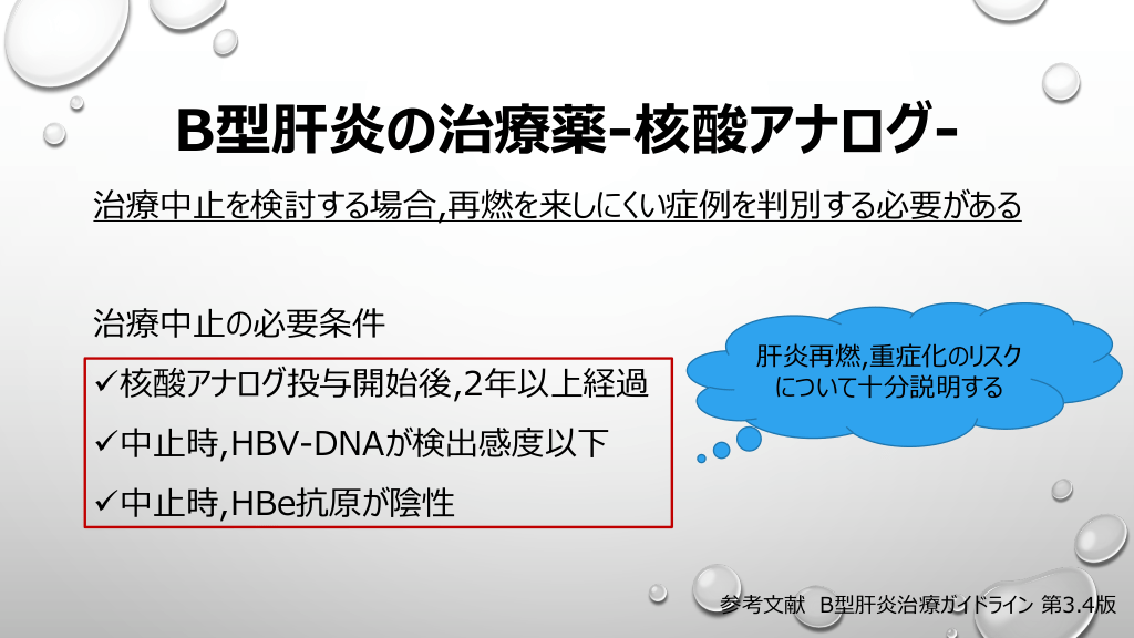 #14. B型肝炎の治療薬-核酸アナログ治療中⽌を検討する場合,再燃を来しにくい症例を判別する必要がある 治療中⽌の必要条件 ü核酸アナログ投与開始後,2年以上経過 肝炎再燃,重症化のリスク について⼗分説明する ü中⽌時,HBV-DNAが検出感度以下 ü中⽌時,HBe抗原が陰性 参考⽂献 B型肝炎治療ガイドライン 第3.4版