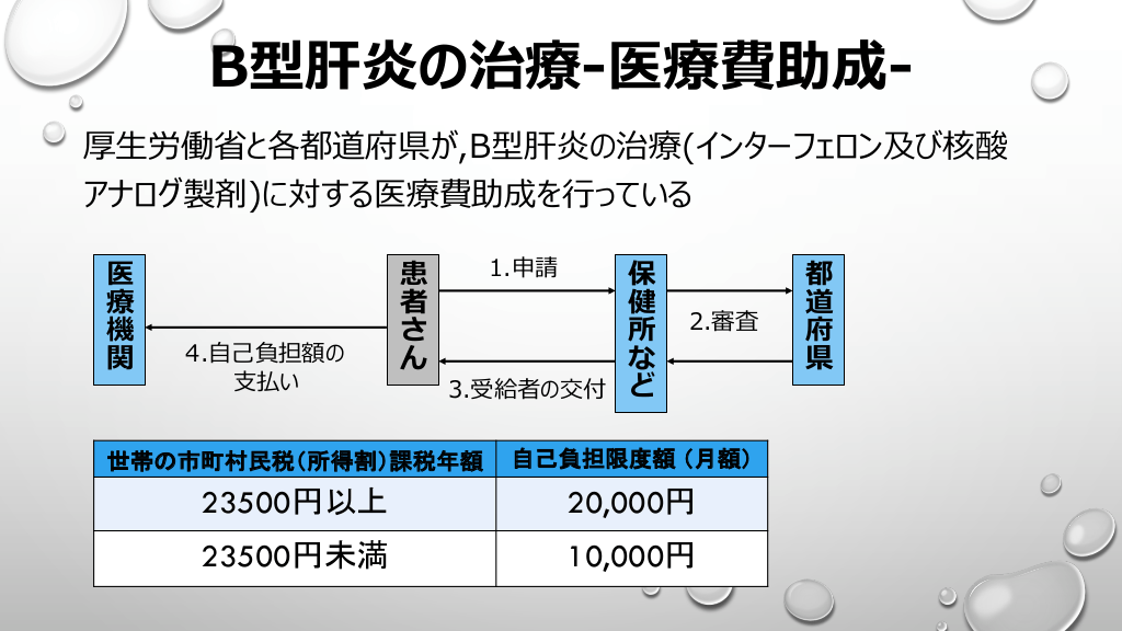 #15. B型肝炎の治療-医療費助成厚⽣労働省と各都道府県が,B型肝炎の治療(インターフェロン及び核酸 アナログ製剤)に対する医療費助成を⾏っている 医 療 機 関 4.⾃⼰負担額の ⽀払い 患 者 ' ( 1.申請 保 健 所 , 3.受給者の交付 - 2.審査 世帯の市町村民税(所得割)課税年額 自己負担限度額 (月額) 23500円以上 20,000円 23500円未満 10,000円 都 道 府 県