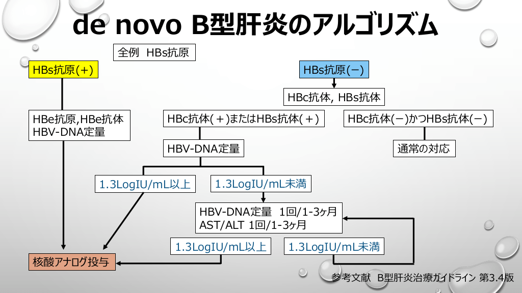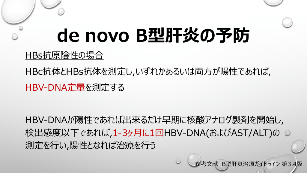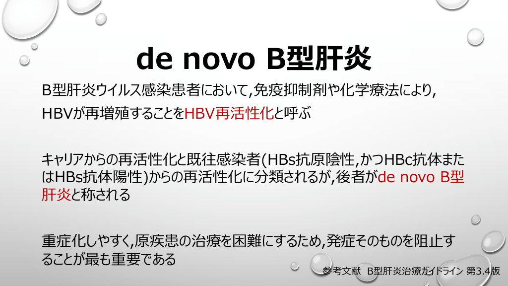 #17. de novo B型肝炎 B型肝炎ウイルス感染患者において,免疫抑制剤や化学療法により, HBVが再増殖することをHBV再活性化と呼ぶ キャリアからの再活性化と既往感染者(HBs抗原陰性,かつHBc抗体また はHBs抗体陽性)からの再活性化に分類されるが,後者がde novo B型 肝炎と称される 重症化しやすく,原疾患の治療を困難にするため,発症そのものを阻⽌す ることが最も重要である 参考⽂献 B型肝炎治療ガイドライン 第3.4版
