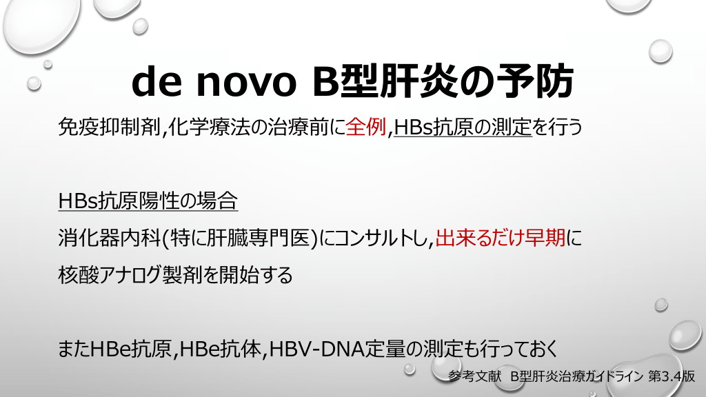 #18. de novo B型肝炎の予防 免疫抑制剤,化学療法の治療前に全例,HBs抗原の測定を⾏う HBs抗原陽性の場合 消化器内科(特に肝臓専⾨医)にコンサルトし,出来るだけ早期に 核酸アナログ製剤を開始する またHBe抗原,HBe抗体,HBV-DNA定量の測定も⾏っておく 参考⽂献 B型肝炎治療ガイドライン 第3.4版