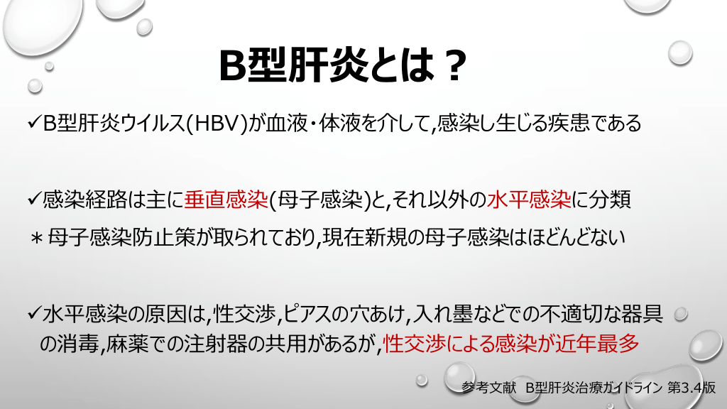 #2. B型肝炎とは︖ üB型肝炎ウイルス(HBV)が⾎液・体液を介して,感染し⽣じる疾患である ü感染経路は主に垂直感染(⺟⼦感染)と,それ以外の⽔平感染に分類 *⺟⼦感染防⽌策が取られており,現在新規の⺟⼦感染はほどんどない ü⽔平感染の原因は,性交渉,ピアスの⽳あけ,⼊れ墨などでの不適切な器具 の消毒,⿇薬での注射器の共⽤があるが,性交渉による感染が近年最多 参考⽂献 B型肝炎治療ガイドライン 第3.4版