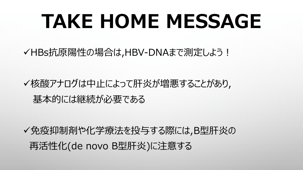 #21. TAKE HOME MESSAGE üHBs抗原陽性の場合は,HBV-DNAまで測定しよう︕ ü核酸アナログは中⽌によって肝炎が増悪することがあり, 基本的には継続が必要である ü免疫抑制剤や化学療法を投与する際には,B型肝炎の 再活性化(de novo B型肝炎)に注意する