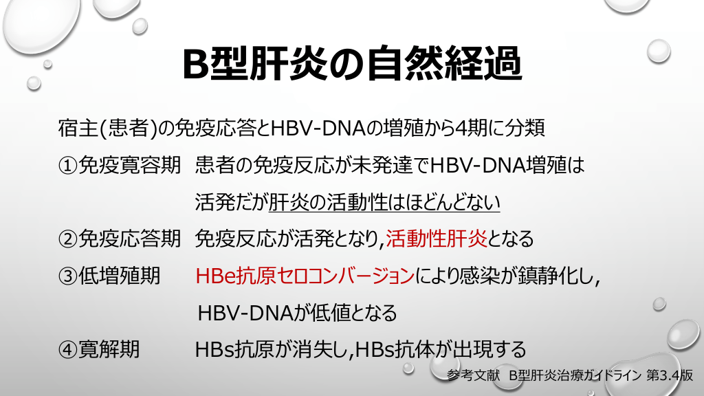 #3. B型肝炎の⾃然経過 宿主(患者)の免疫応答とHBV-DNAの増殖から4期に分類 ①免疫寛容期 患者の免疫反応が未発達でHBV-DNA増殖は 活発だが肝炎の活動性はほどんどない ②免疫応答期 免疫反応が活発となり,活動性肝炎となる ③低増殖期 HBe抗原セロコンバージョンにより感染が鎮静化し, HBV-DNAが低値となる ④寛解期 HBs抗原が消失し,HBs抗体が出現する 参考⽂献 B型肝炎治療ガイドライン 第3.4版