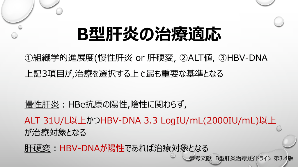 #6. B型肝炎の治療適応 ①組織学的進展度(慢性肝炎 or 肝硬変, ②ALT値, ③HBV-DNA 上記3項⽬が,治療を選択する上で最も重要な基準となる 慢性肝炎︓HBe抗原の陽性,陰性に関わらず, ALT 31U/L以上かつHBV-DNA 3.3 LogIU/mL(2000IU/mL)以上 が治療対象となる 肝硬変︓HBV-DNAが陽性であれば治療対象となる 参考⽂献 B型肝炎治療ガイドライン 第3.4版