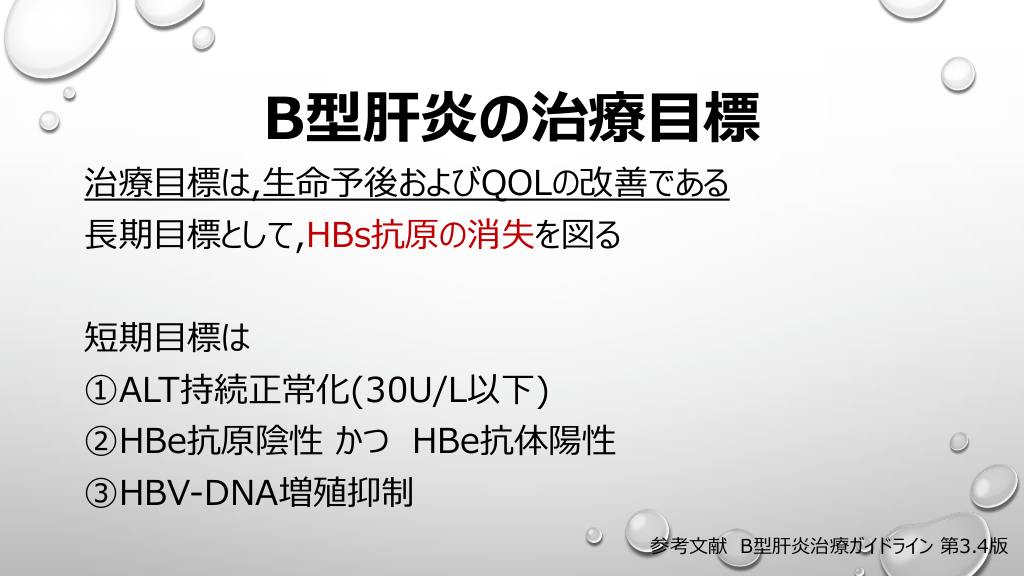#7. B型肝炎の治療⽬標 治療⽬標は,⽣命予後およびQOLの改善である ⻑期⽬標として,HBs抗原の消失を図る 短期⽬標は ①ALT持続正常化(30U/L以下) ②HBe抗原陰性 かつ HBe抗体陽性 ③HBV-DNA増殖抑制 参考⽂献 B型肝炎治療ガイドライン 第3.4版