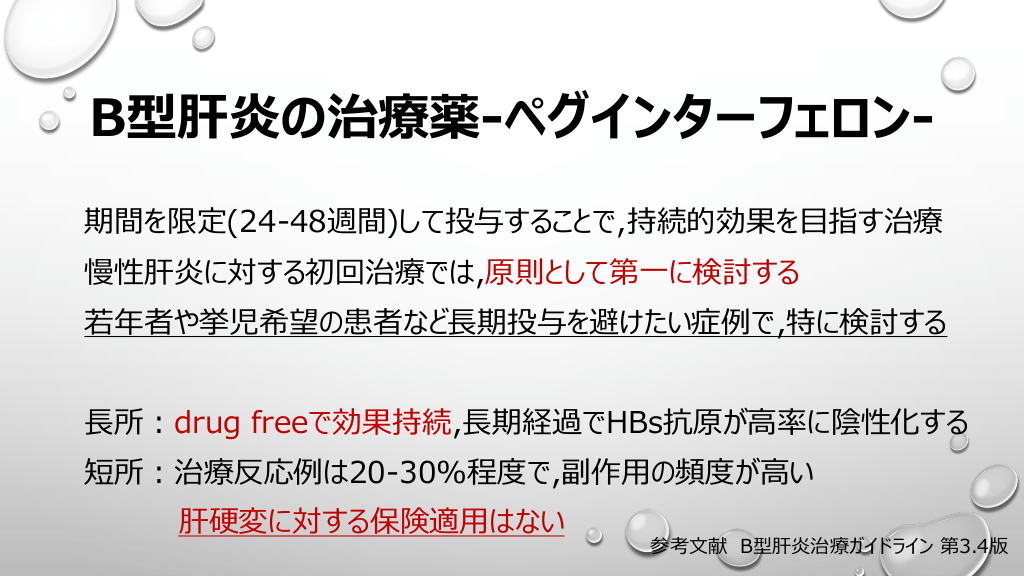 #8. B型肝炎の治療薬-ペグインターフェロン期間を限定(24-48週間)して投与することで,持続的効果を⽬指す治療 慢性肝炎に対する初回治療では,原則として第⼀に検討する 若年者や挙児希望の患者など⻑期投与を避けたい症例で,特に検討する ⻑所︓drug freeで効果持続,⻑期経過でHBs抗原が⾼率に陰性化する 短所︓治療反応例は20-30%程度で,副作⽤の頻度が⾼い 肝硬変に対する保険適⽤はない 参考⽂献 B型肝炎治療ガイドライン 第3.4版