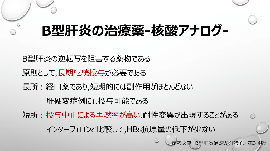 #9. B型肝炎の治療薬-核酸アナログB型肝炎の逆転写を阻害する薬物である 原則として,⻑期継続投与が必要である ⻑所︓経⼝薬であり,短期的には副作⽤がほとんどない 肝硬変症例にも投与可能である 短所︓投与中⽌による再燃率が⾼い.耐性変異が出現することがある インターフェロンと⽐較して,HBs抗原量の低下が少ない 参考⽂献 B型肝炎治療ガイドライン 第3.4版