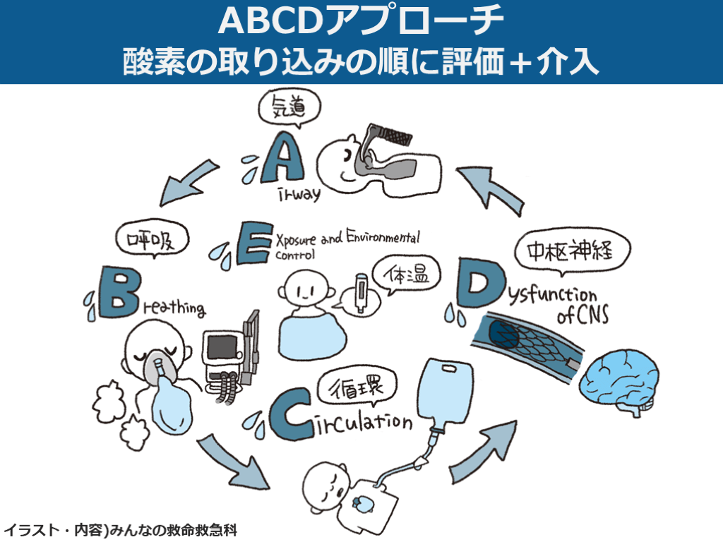 念頭に進める! Primary survey ABCDアプローチ イラスト・内容)みんなの救命救急科