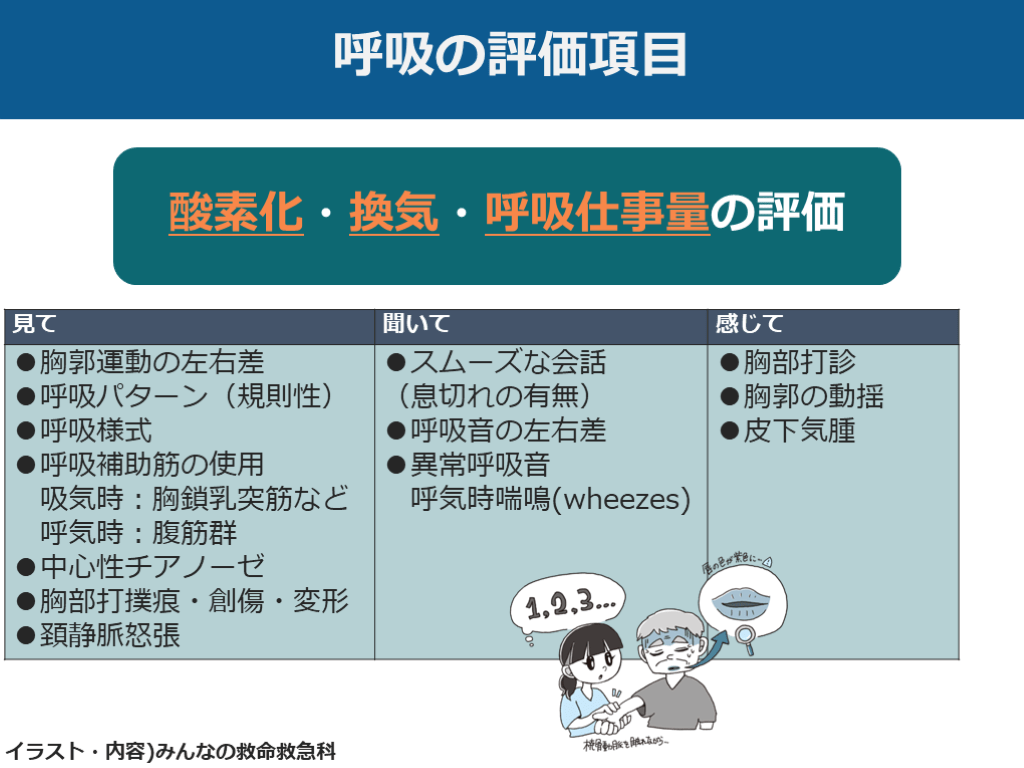 #5. 呼吸の評価項目 酸素化・換気・呼吸仕事量の評価 イラスト・内容)みんなの救命救急科