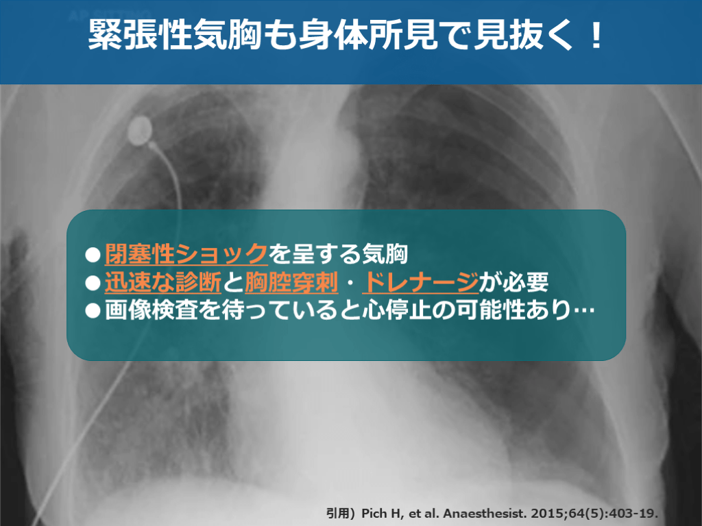 #7. 緊張性気胸も身体所見で見抜く! 引用) Pich H, et al. Anaesthesist. 2015;64(5):403-19. ●閉塞性ショックを呈する気胸