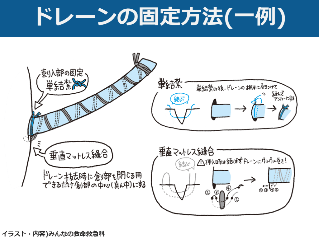 #13. ドレーンの固定方法(一例) イラスト・内容)みんなの救命救急科