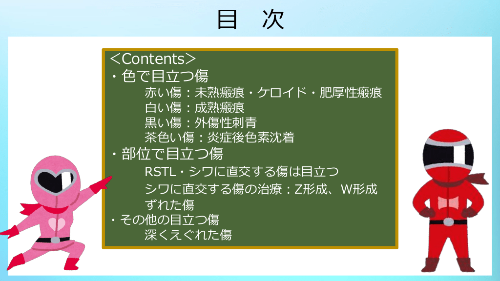 #3. 目 次 <Contents> ・色で目立つ傷 赤い傷:未熟瘢痕・ケロイド・肥厚性瘢痕 白い傷:成熟瘢痕 黒い傷:外傷性刺青 茶色い傷:炎症後色素沈着 ・部位で目立つ傷 RSTL・シワに直交する傷は目立つ シワに直交する傷の治療:Z形成、W形成 ずれた傷 ・その他の目立つ傷 深くえぐれた傷