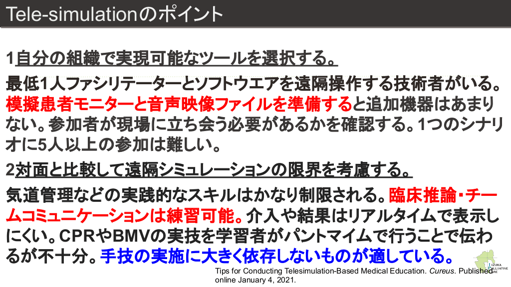 #11. Tele-simulationのポイント 1自分の組織で実現可能なツールを選択する。 最低1人ファシリテーターとソフトウエアを遠隔操作する技術者がいる。 模擬患者モニターと音声映像ファイルを準備すると追加機器はあまり ない。参加者が現場に立ち会う必要があるかを確認する。1つのシナリ オに5人以上の参加は難しい。 2対面と比較して遠隔シミュレーションの限界を考慮する。 気道管理などの実践的なスキルはかなり制限される。臨床推論・チー ムコミュニケーションは練習可能。介入や結果はリアルタイムで表示し にくい。CPRやBMVの実技を学習者がパントマイムで行うことで伝わ るが不十分。手技の実施に大きく依存しないものが適している。 Tips for Conducting Telesimulation-Based Medical Education. Cureus. Published online January 4, 2021.