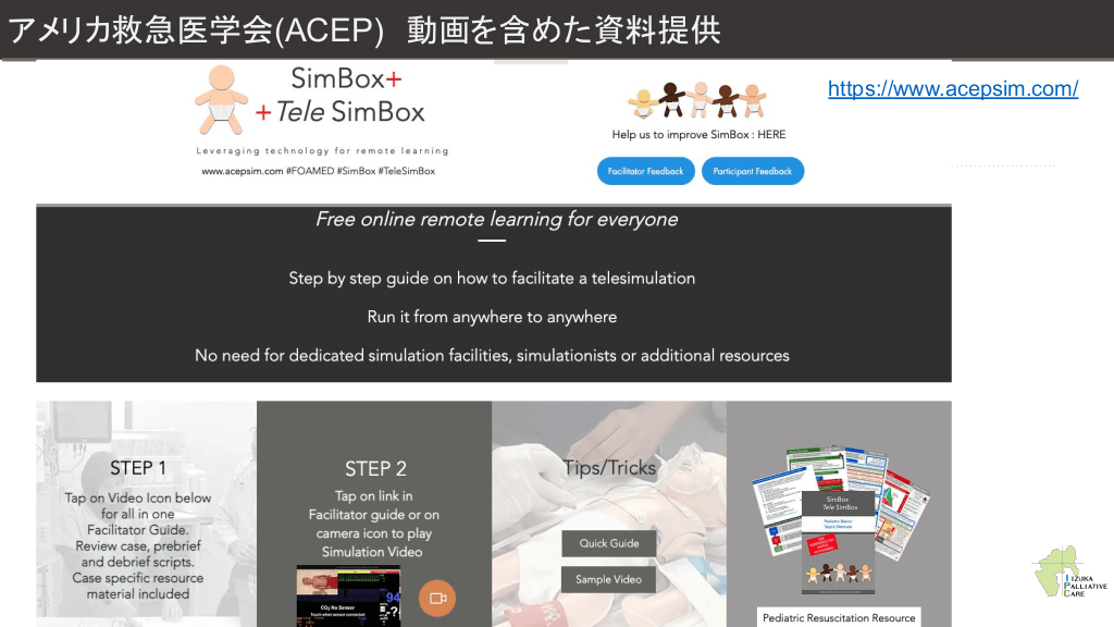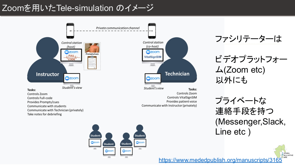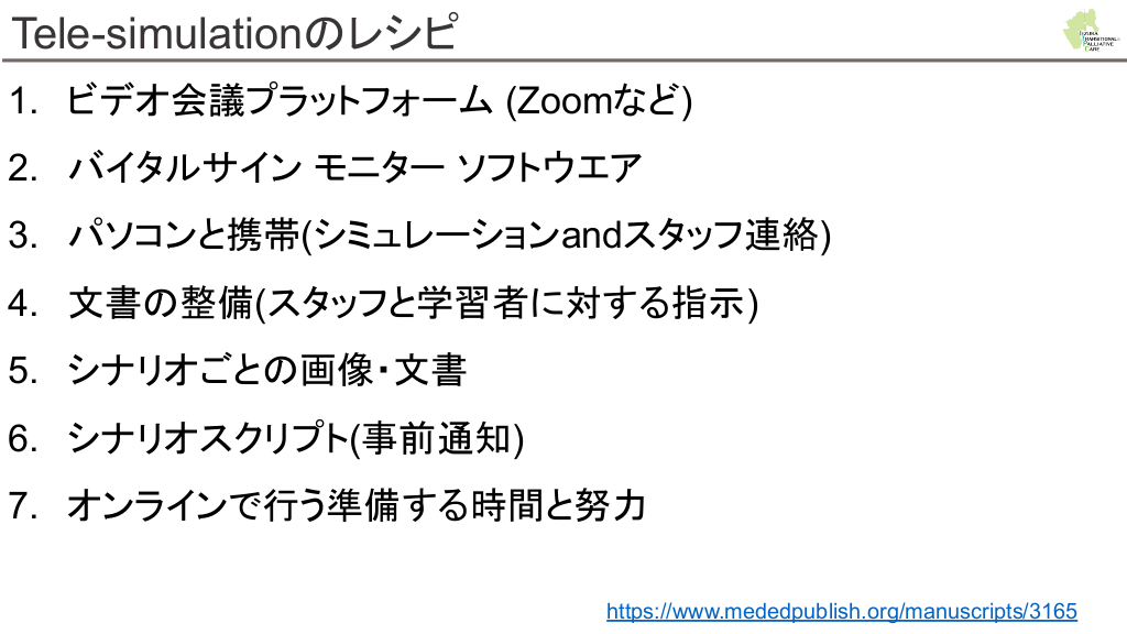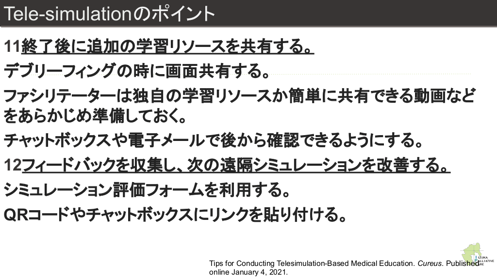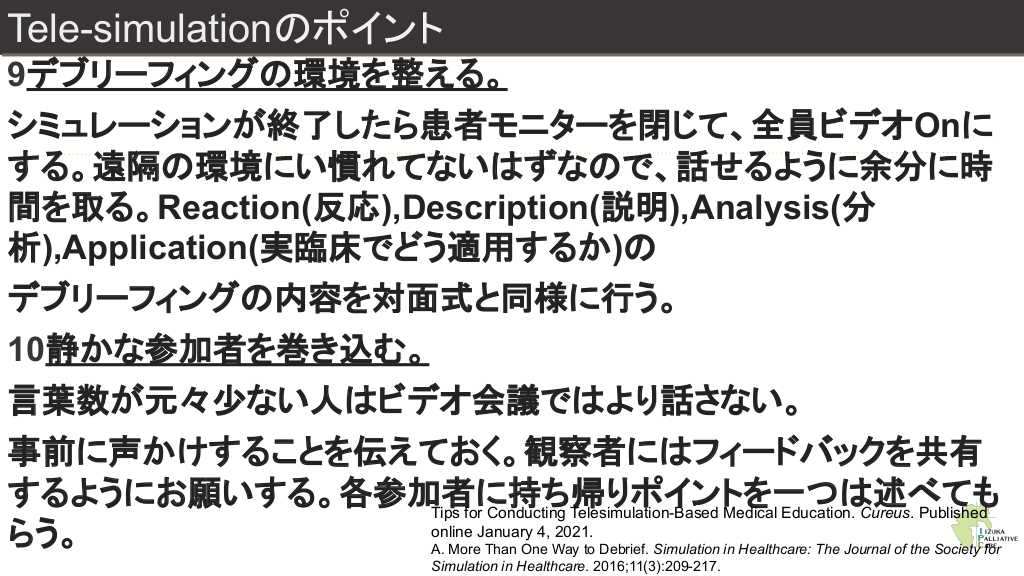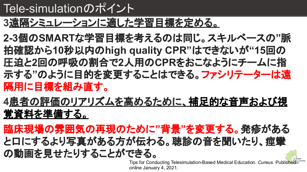 #12. Tele-simulationのポイント 3遠隔シミュレーションに適した学習目標を定める。 2-3個のSMARTな学習目標を考えるのは同じ。スキルベースの”脈 拍確認から10秒以内のhigh quality CPR”はできないが“15回の 圧迫と2回の呼吸の割合で2人用のCPRをおこなようにチームに指 示する”のように目的を変更することはできる。ファシリテーターは遠 隔用に目標を組み直す。 4患者の評価のリアリズムを高めるために、補足的な音声および視 覚資料を準備する。 臨床現場の雰囲気の再現のために”背景”を変更する。発疹がある と口にするより写真がある方が伝わる。聴診の音を聞いたり、痙攣 の動画を見せたりすることができる。 Tips for Conducting Telesimulation-Based Medical Education. Cureus. Published online January 4, 2021.