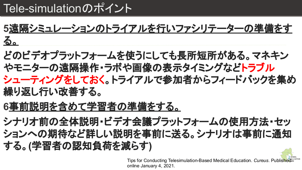 #14. Tele-simulationのポイント 5遠隔シミュレーションのトライアルを行いファシリテーターの準備をす る。 どのビデオプラットフォームを使うにしても長所短所がある。マネキン やモニターの遠隔操作・ラボや画像の表示タイミングなどトラブル シューティングをしておく。トライアルで参加者からフィードバックを集め 繰り返し行い改善する。 6事前説明を含めて学習者の準備をする。 シナリオ前の全体説明・ビデオ会議プラットフォームの使用方法・セッ ションへの期待など詳しい説明を事前に送る。シナリオは事前に通知 する。(学習者の認知負荷を減らす) Tips for Conducting Telesimulation-Based Medical Education. Cureus. Published online January 4, 2021.