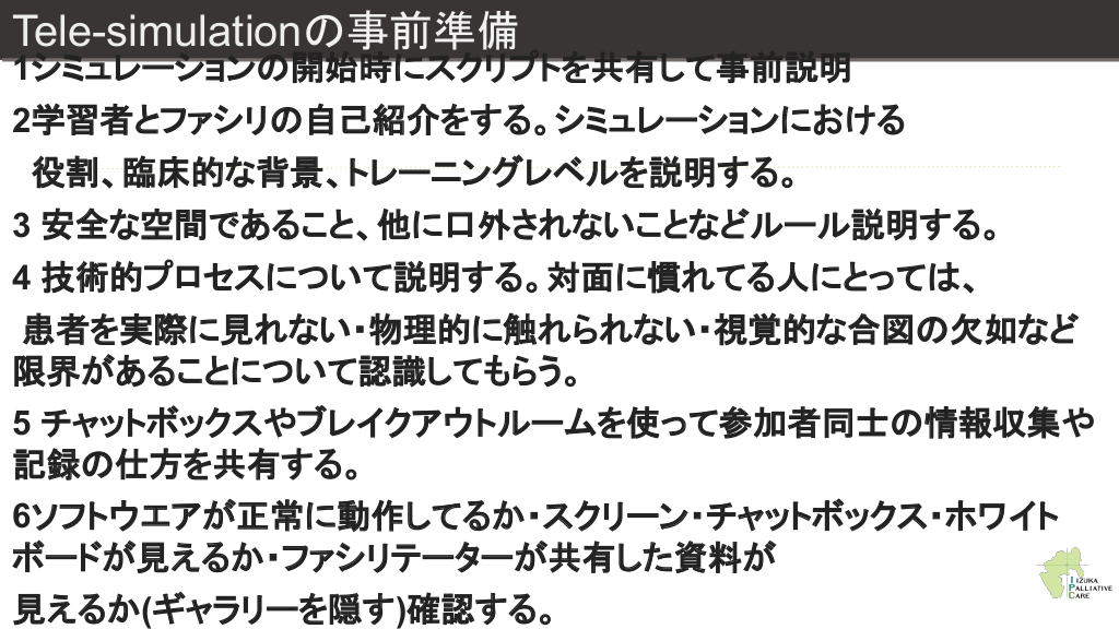 #15. Tele-simulationの事前準備 1シミュレーションの開始時にスクリプトを共有して事前説明 2学習者とファシリの自己紹介をする。シミュレーションにおける 役割、臨床的な背景、トレーニングレベルを説明する。 3 安全な空間であること、他に口外されないことなどルール説明する。 4 技術的プロセスについて説明する。対面に慣れてる人にとっては、 患者を実際に見れない・物理的に触れられない・視覚的な合図の欠如など 限界があることについて認識してもらう。 5 チャットボックスやブレイクアウトルームを使って参加者同士の情報収集や 記録の仕方を共有する。 6ソフトウエアが正常に動作してるか・スクリーン・チャットボックス・ホワイト ボードが見えるか・ファシリテーターが共有した資料が 見えるか(ギャラリーを隠す)確認する。