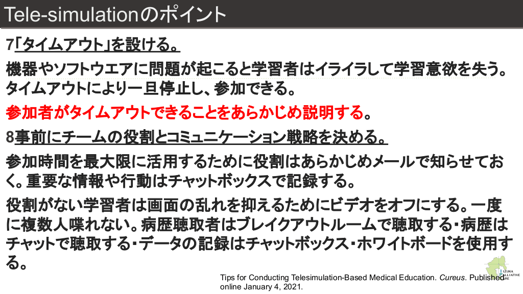 #16. Tele-simulationのポイント 7「タイムアウト」を設ける。 機器やソフトウエアに問題が起こると学習者はイライラして学習意欲を失う。 タイムアウトにより一旦停止し、参加できる。 参加者がタイムアウトできることをあらかじめ説明する。 8事前にチームの役割とコミュニケーション戦略を決める。 参加時間を最大限に活用するために役割はあらかじめメールで知らせてお く。重要な情報や行動はチャットボックスで記録する。 役割がない学習者は画面の乱れを抑えるためにビデオをオフにする。一度 に複数人喋れない。病歴聴取者はブレイクアウトルームで聴取する・病歴は チャットで聴取する・データの記録はチャットボックス・ホワイトボードを使用す る。 Tips for Conducting Telesimulation-Based Medical Education. Cureus. Published online January 4, 2021.
