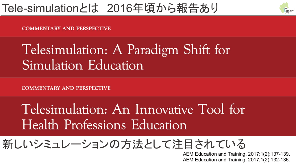 #2. Tele-simulationとは 2016年頃から報告あり 新しいシミュレーションの方法として注目されている AEM Education and Training. 2017;1(2):137-139. AEM Education and Training. 2017;1(2):132-136.