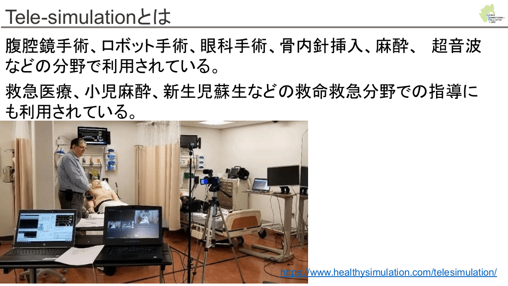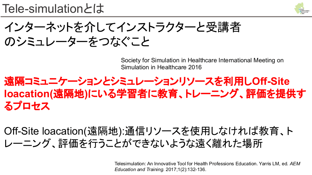 #3. Tele-simulationとは インターネットを介してインストラクターと受講者 のシミュレーターをつなぐこと Society for Simulation in Healthcare International Meeting on Simulation in Healthcare 2016 遠隔コミュニケーションとシミュレーションリソースを利用しOff-Site loacation(遠隔地)にいる学習者に教育、トレーニング、評価を提供す るプロセス Off-Site loacation(遠隔地):通信リソースを使用しなければ教育、ト レーニング、評価を行うことができないような遠く離れた場所 Telesimulation: An Innovative Tool for Health Professions Education. Yarris LM, ed. AEM Education and Training. 2017;1(2):132-136.