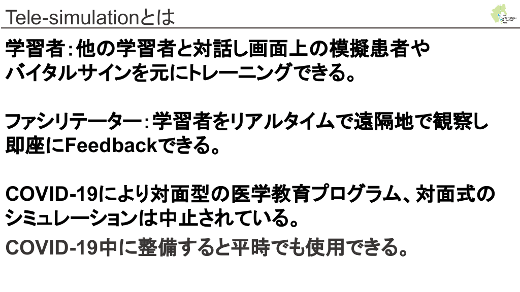 #5. Tele-simulationとは 学習者:他の学習者と対話し画面上の模擬患者や バイタルサインを元にトレーニングできる。 ファシリテーター:学習者をリアルタイムで遠隔地で観察し 即座にFeedbackできる。 COVID-19により対面型の医学教育プログラム、対面式の シミュレーションは中止されている。 COVID-19中に整備すると平時でも使用できる。