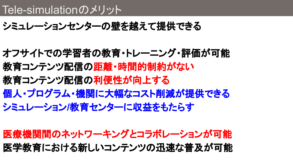 #6. Tele-simulationのメリット シミュレーションセンターの壁を越えて提供できる オフサイトでの学習者の教育・トレーニング・評価が可能 教育コンテンツ配信の距離・時間的制約がない 教育コンテンツ配信の利便性が向上する 個人・プログラム・機関に大幅なコスト削減が提供できる シミュレーション/教育センターに収益をもたらす 医療機関間のネットワーキングとコラボレーションが可能 医学教育における新しいコンテンツの迅速な普及が可能