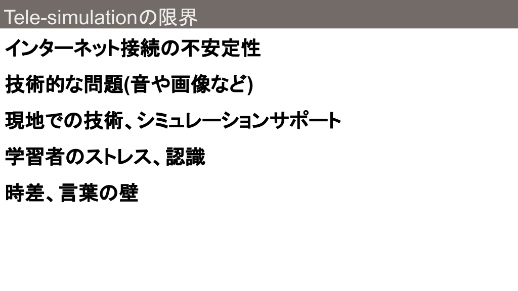 #7. Tele-simulationの限界 インターネット接続の不安定性 技術的な問題(音や画像など) 現地での技術、シミュレーションサポート 学習者のストレス、認識 時差、言葉の壁