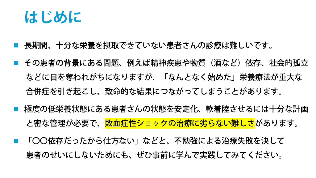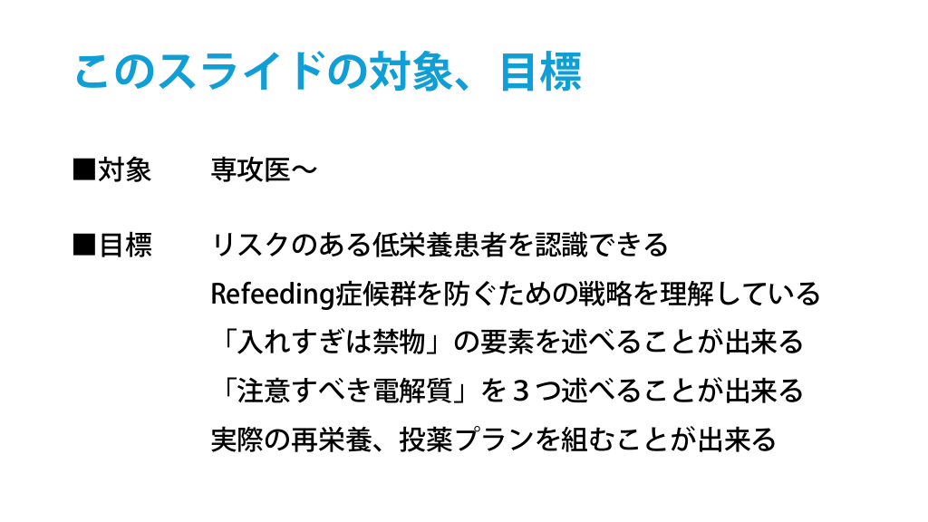 Refeeding症候群を予防するための解説は既に多くありますが、「でも実際にどんな治療にしたらよいか分からない」という研修医や専攻医が少なくなく、このスライドを作成しました。