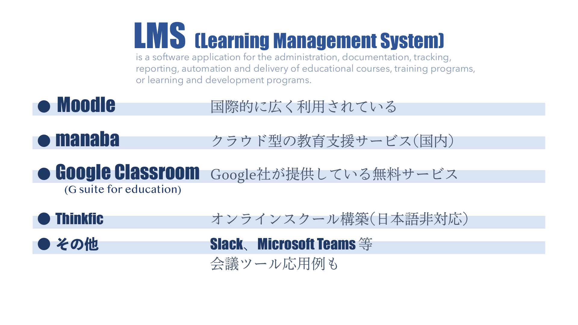 #10. LMS (Learning Management System) is a software application for the administration, documentation, tracking, reporting, automation and delivery of educational courses, training programs, or learning and development programs. ● Moodle ● manaba 国際的に広く利用されている クラウド型の教育支援サービス(国内) ● Google Classroom Google社が提供している無料サービス (G suite for education) ● Thinkfic オンラインスクール構築(日本語非対応) ● その他 Slack、Microsoft Teams 等 会議ツール応用例も