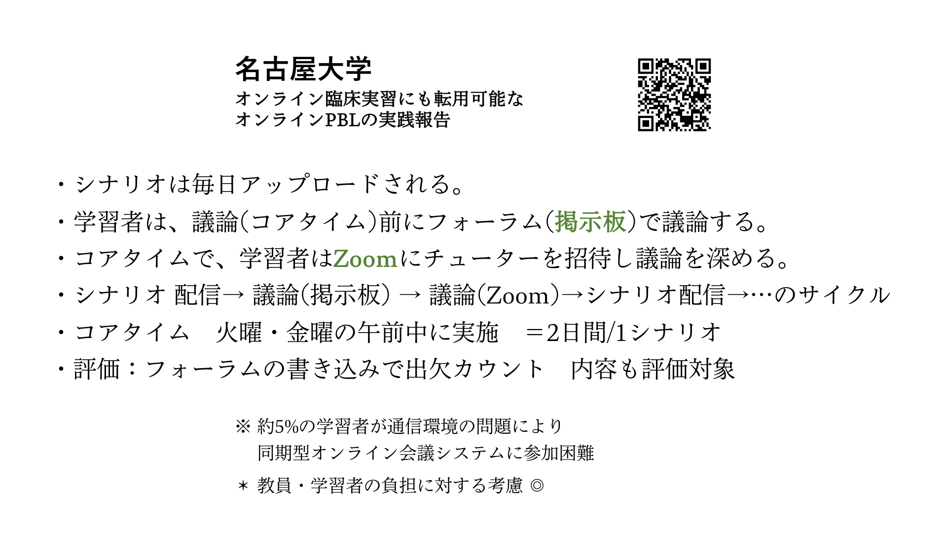 #14. 名古屋⼤学 オンライン臨床実習にも転用可能な オンラインPBLの実践報告 ・シナリオは毎日アップロードされる。 ・学習者は、議論(コアタイム)前にフォーラム(掲示板)で議論する。 ・コアタイムで、学習者はZoomにチューターを招待し議論を深める。 ・シナリオ 配信→ 議論(掲示板) → 議論(Zoom)→シナリオ配信→…のサイクル ・コアタイム 火曜・金曜の午前中に実施 =2日間/1シナリオ ・評価:フォーラムの書き込みで出欠カウント 内容も評価対象 ※ 約5%の学習者が通信環境の問題により 同期型オンライン会議システムに参加困難 * 教員・学習者の負担に対する考慮 ◎