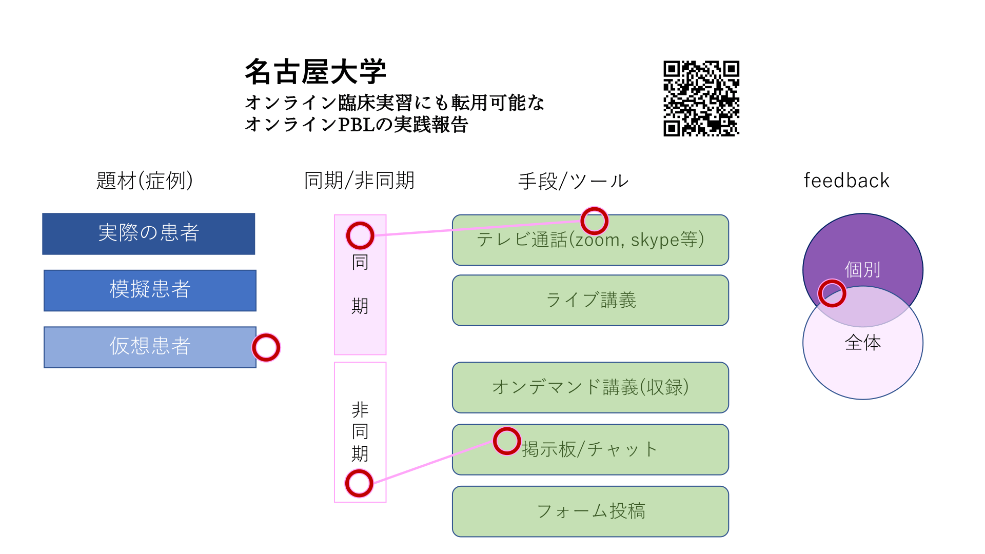 #15. 名古屋⼤学 オンライン臨床実習にも転用可能な オンラインPBLの実践報告 題材(症例) 同期/⾮同期 実際の患者 ⼿段/ツール テレビ通話(zoom, skype等) 同 模擬患者 feedback 期 個別 ライブ講義 全体 仮想患者 オンデマンド講義(収録) ⾮ 同 期 掲⽰板/チャット フォーム投稿