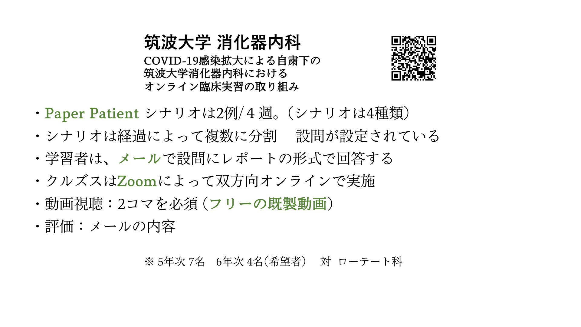 #16. 筑波⼤学 消化器内科 COVID-19感染拡大による自粛下の 筑波大学消化器内科における オンライン臨床実習の取り組み ・Paper Patient シナリオは2例/4週。(シナリオは4種類) ・シナリオは経過によって複数に分割 設問が設定されている ・学習者は、メールで設問にレポートの形式で回答する ・クルズスはZoomによって双方向オンラインで実施 ・動画視聴:2コマを必須 (フリーの既製動画) ・評価:メールの内容 ※ 5年次 7名 6年次 4名(希望者) 対 ローテート科