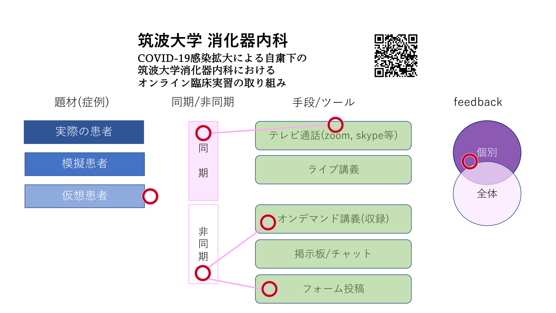 #17. 筑波⼤学 消化器内科 COVID-19感染拡大による自粛下の 筑波大学消化器内科における オンライン臨床実習の取り組み 題材(症例) 同期/⾮同期 実際の患者 ⼿段/ツール テレビ通話(zoom, skype等) 同 模擬患者 feedback 期 個別 ライブ講義 全体 仮想患者 オンデマンド講義(収録) ⾮ 同 期 掲⽰板/チャット フォーム投稿