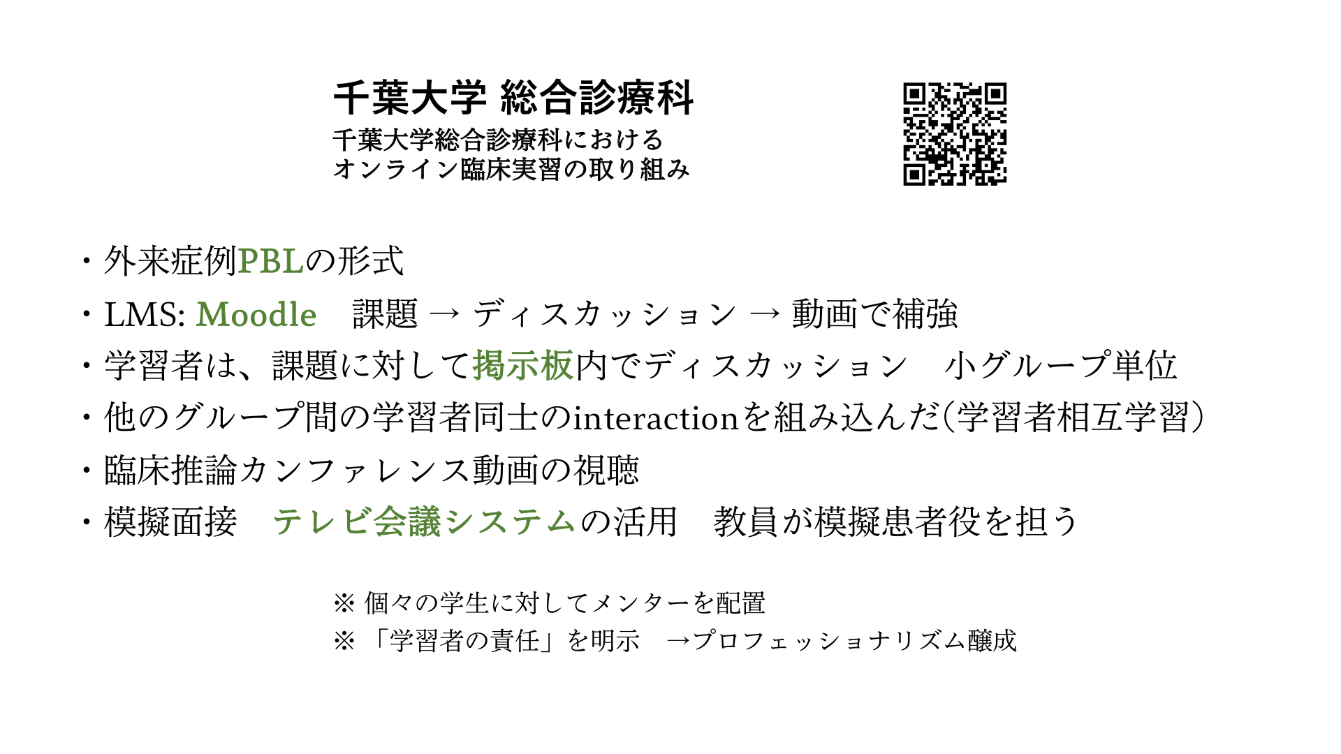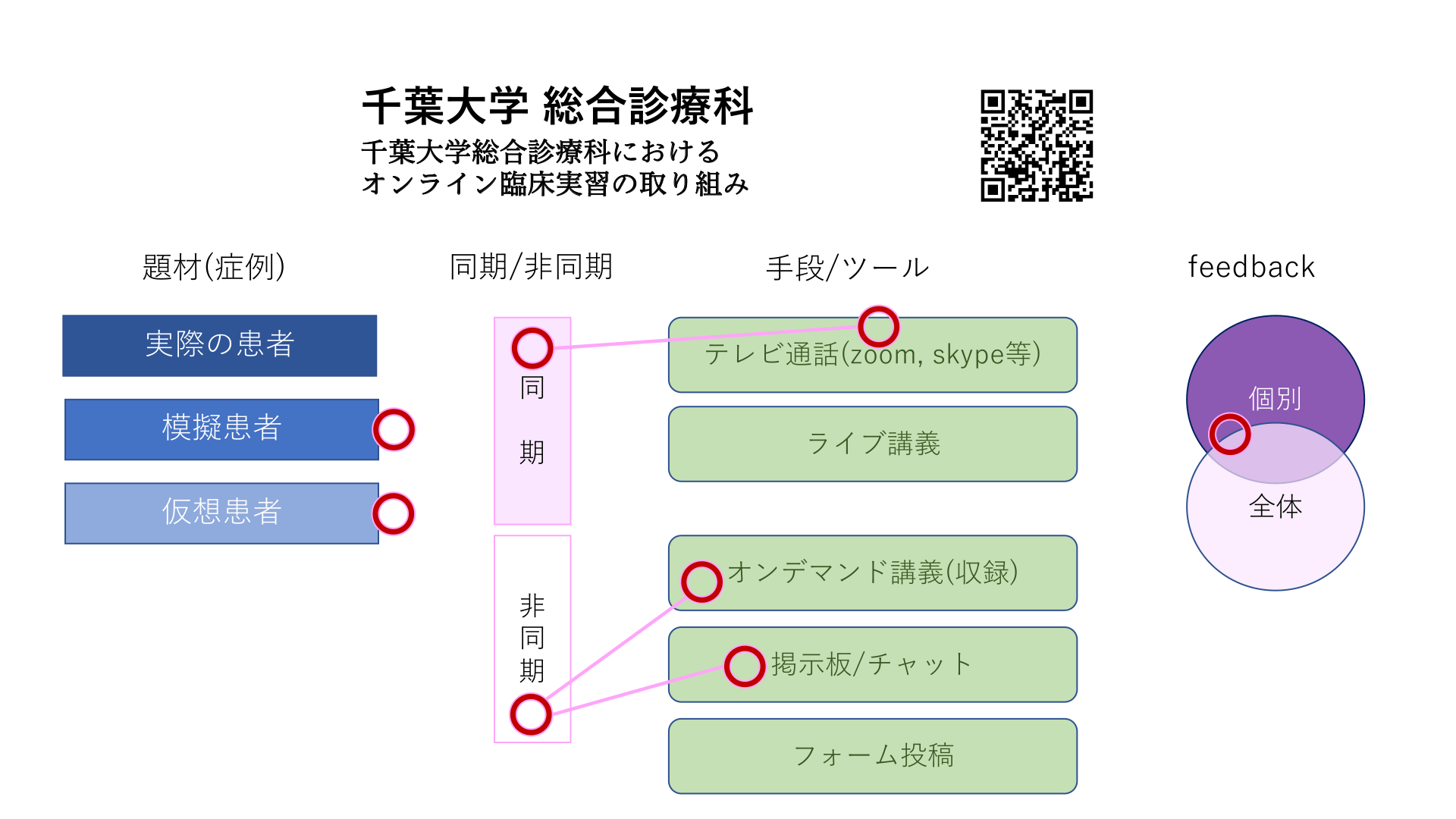 #19. 千葉⼤学 総合診療科 千葉大学総合診療科における オンライン臨床実習の取り組み 題材(症例) 同期/⾮同期 実際の患者 ⼿段/ツール テレビ通話(zoom, skype等) 同 模擬患者 feedback 期 個別 ライブ講義 全体 仮想患者 オンデマンド講義(収録) ⾮ 同 期 掲⽰板/チャット フォーム投稿