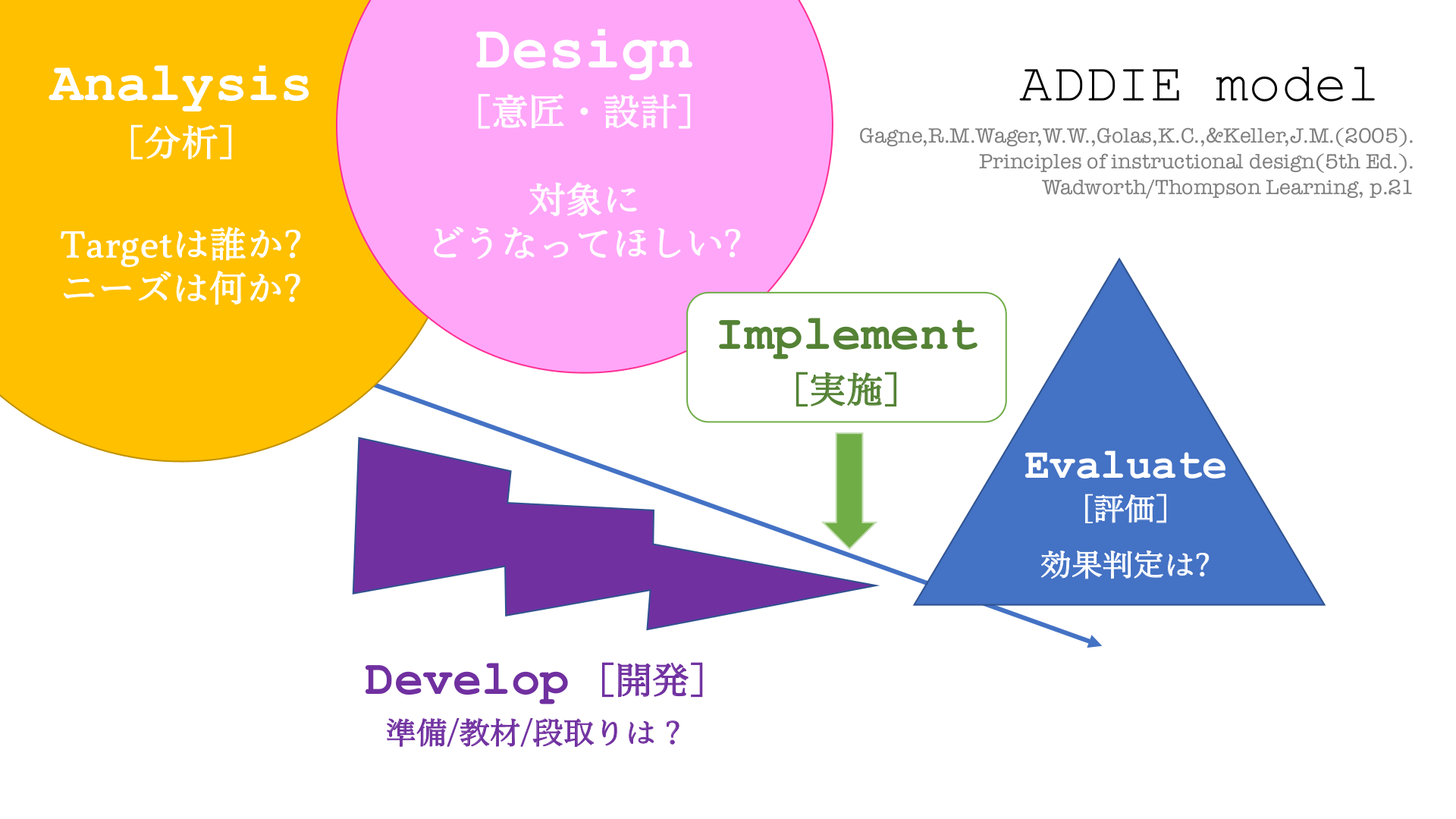 #22. Analysis [分析] Targetは誰か? ニーズは何か? Design ADDIE model [意匠・設計] 対象に どうなってほしい? Gagne,R.M.Wager,W.W.,Golas,K.C.,&Keller,J.M.(2005). Principles of instructional design(5th Ed.). Wadworth/Thompson Learning, p.21 Implement [実施] Evaluate [評価] 効果判定は? Develop [開発] 準備/教材/段取りは ?