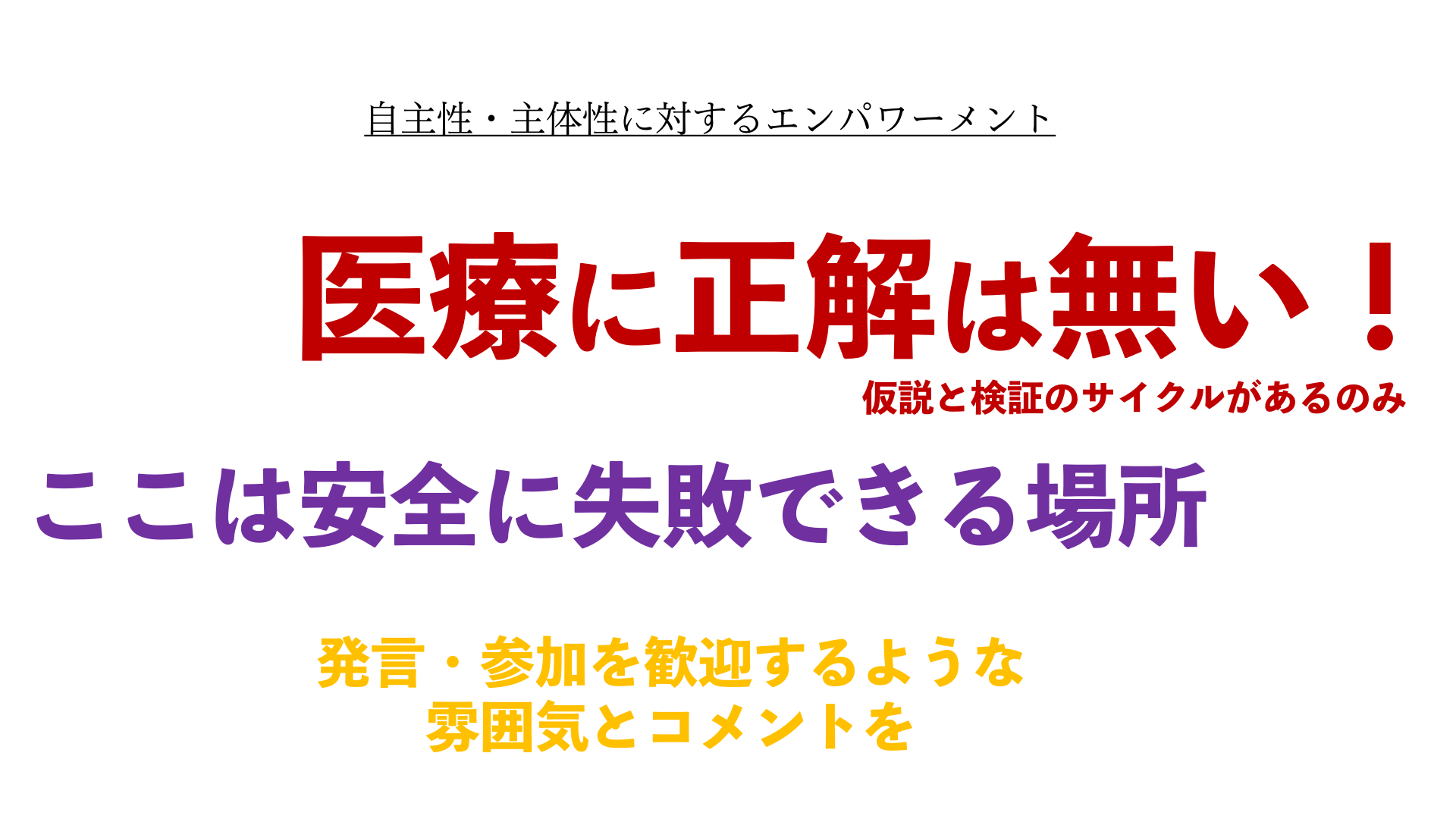 #28. 自主性・主体性に対するエンパワーメント 医療に正解は無い! 仮説と検証のサイクルがあるのみ ここは安全に失敗できる場所 発言・参加を歓迎するような 雰囲気とコメントを