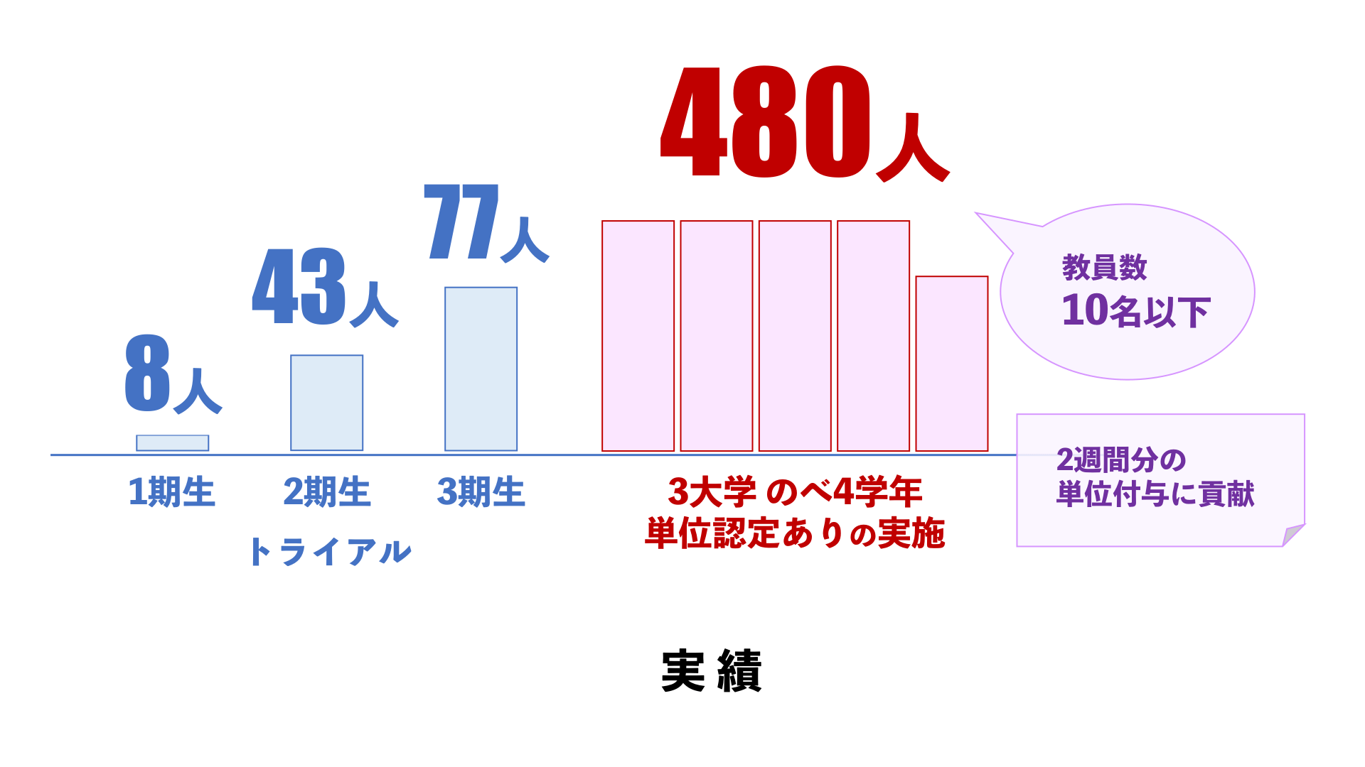 #38. 8人 1期生 43人 2期生 トライアル 77人 480人 教員数 10名以下 3期生 3大学 のべ4学年 単位認定ありの実施 実績 2週間分の 単位付与に貢献