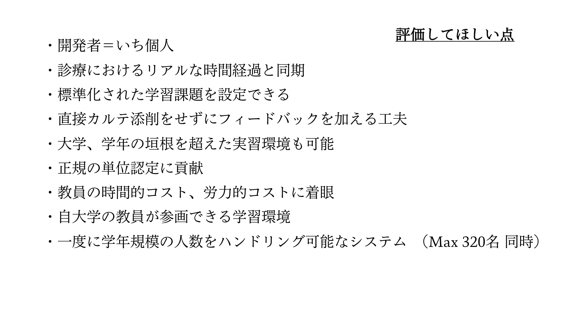 #40. ・開発者=いち個人 評価してほしい点 ・診療におけるリアルな時間経過と同期 ・標準化された学習課題を設定できる ・直接カルテ添削をせずにフィードバックを加える工夫 ・大学、学年の垣根を超えた実習環境も可能 ・正規の単位認定に貢献 ・教員の時間的コスト、労力的コストに着眼 ・自大学の教員が参画できる学習環境 ・一度に学年規模の人数をハンドリング可能なシステム (Max 320名 同時)