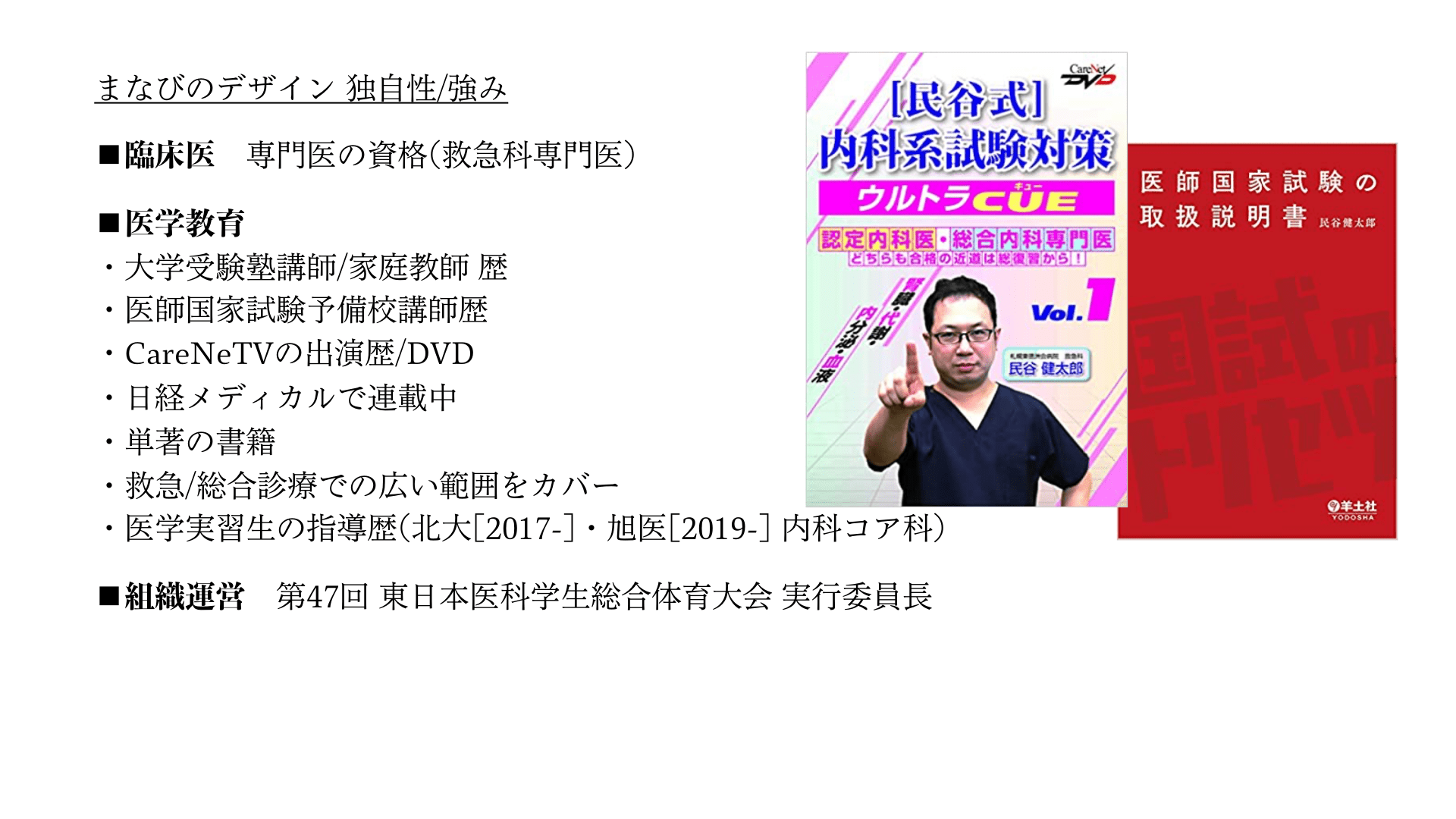 #41. まなびのデザイン 独自性/強み ■臨床医 専門医の資格(救急科専門医) ■医学教育 ・大学受験塾講師/家庭教師 歴 ・医師国家試験予備校講師歴 ・CareNeTVの出演歴/DVD ・日経メディカルで連載中 ・単著の書籍 ・救急/総合診療での広い範囲をカバー ・医学実習生の指導歴(北大[2017-]・旭医[2019-] 内科コア科) ■組織運営 第47回 東日本医科学生総合体育大会 実行委員長