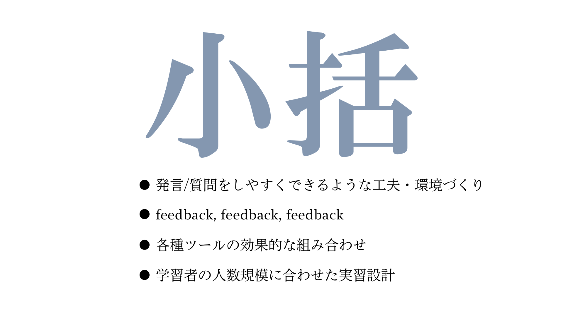 #42. 小括 ● 発言/質問をしやすくできるような工夫・環境づくり ● feedback, feedback, feedback ● 各種ツールの効果的な組み合わせ ● 学習者の人数規模に合わせた実習設計