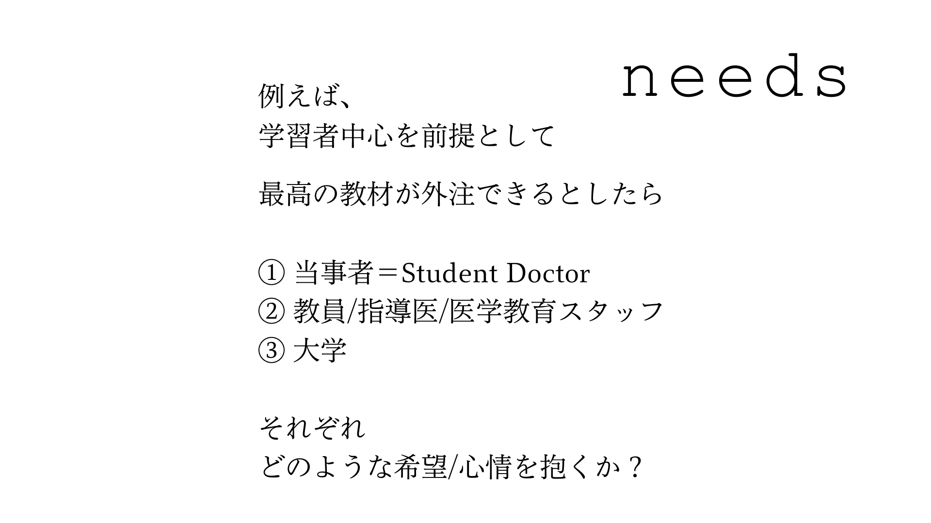 #43. 例えば、 学習者中心を前提として needs 最高の教材が外注できるとしたら ① 当事者=Student Doctor ② 教員/指導医/医学教育スタッフ ③ 大学 それぞれ どのような希望/心情を抱くか ?