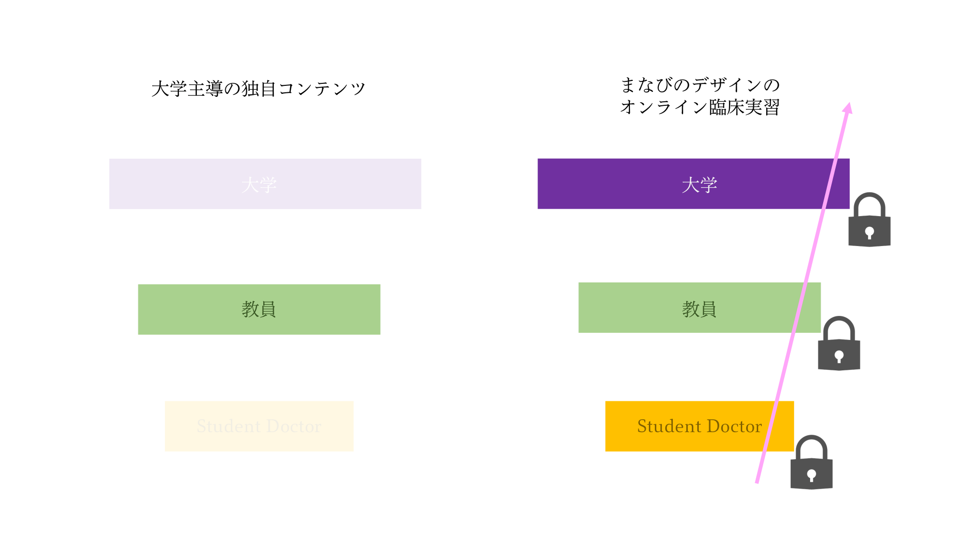 #44. 大学主導の独自コンテンツ まなびのデザインの オンライン臨床実習 大学 大学 教員 教員 Student Doctor Student Doctor