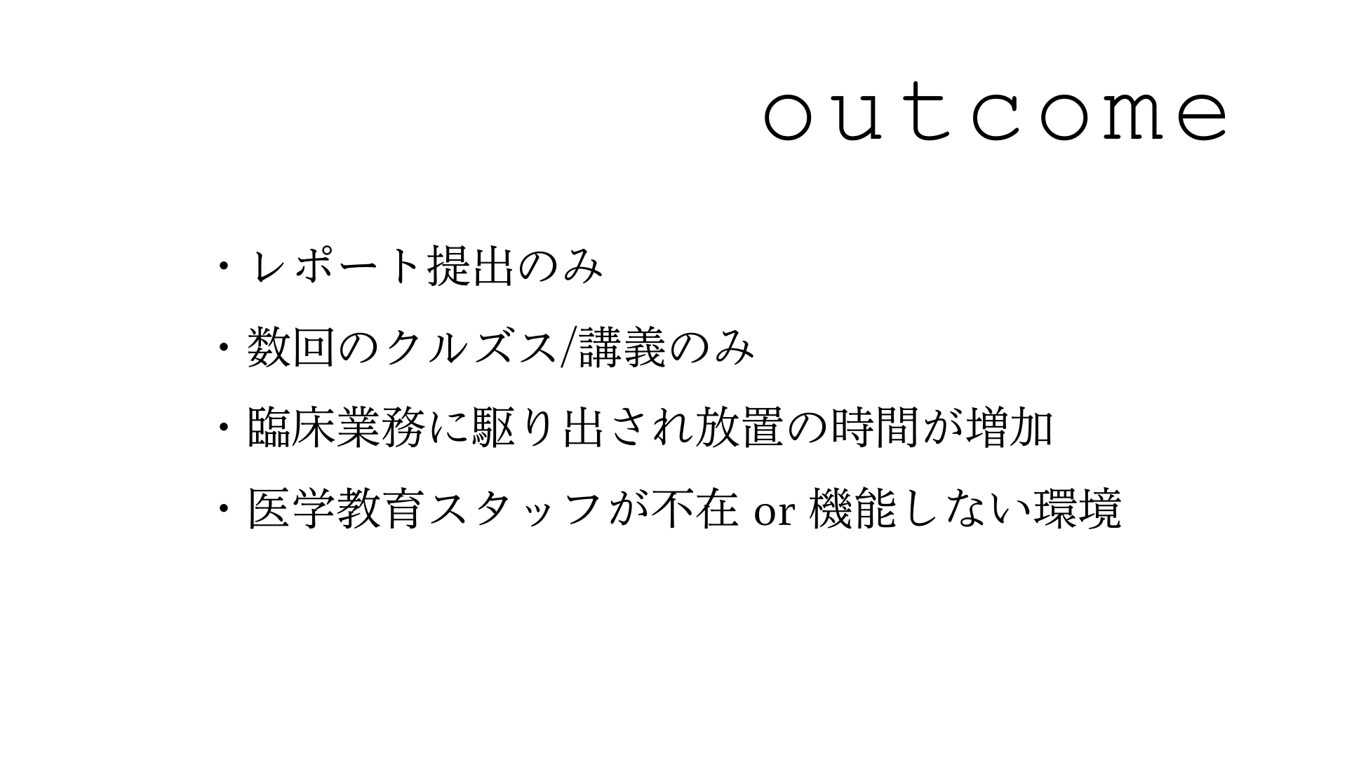 #45. outcome ・レポート提出のみ ・数回のクルズス/講義のみ ・臨床業務に駆り出され放置の時間が増加 ・医学教育スタッフが不在 or 機能しない環境