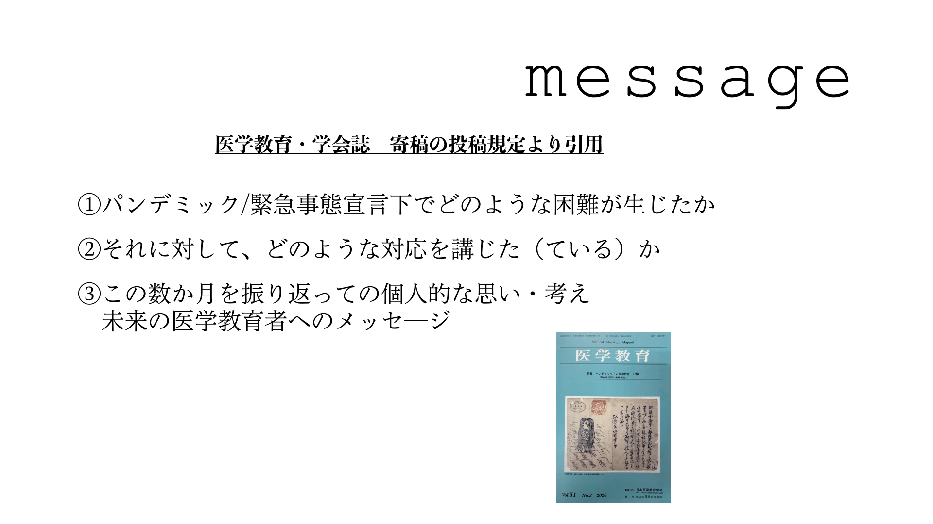 #48. message 医学教育・学会誌 寄稿の投稿規定より引用 ①パンデミック/緊急事態宣言下でどのような困難が生じたか ②それに対して、どのような対応を講じた(ている)か ③この数か月を振り返っての個人的な思い・考え 未来の医学教育者へのメッセ―ジ