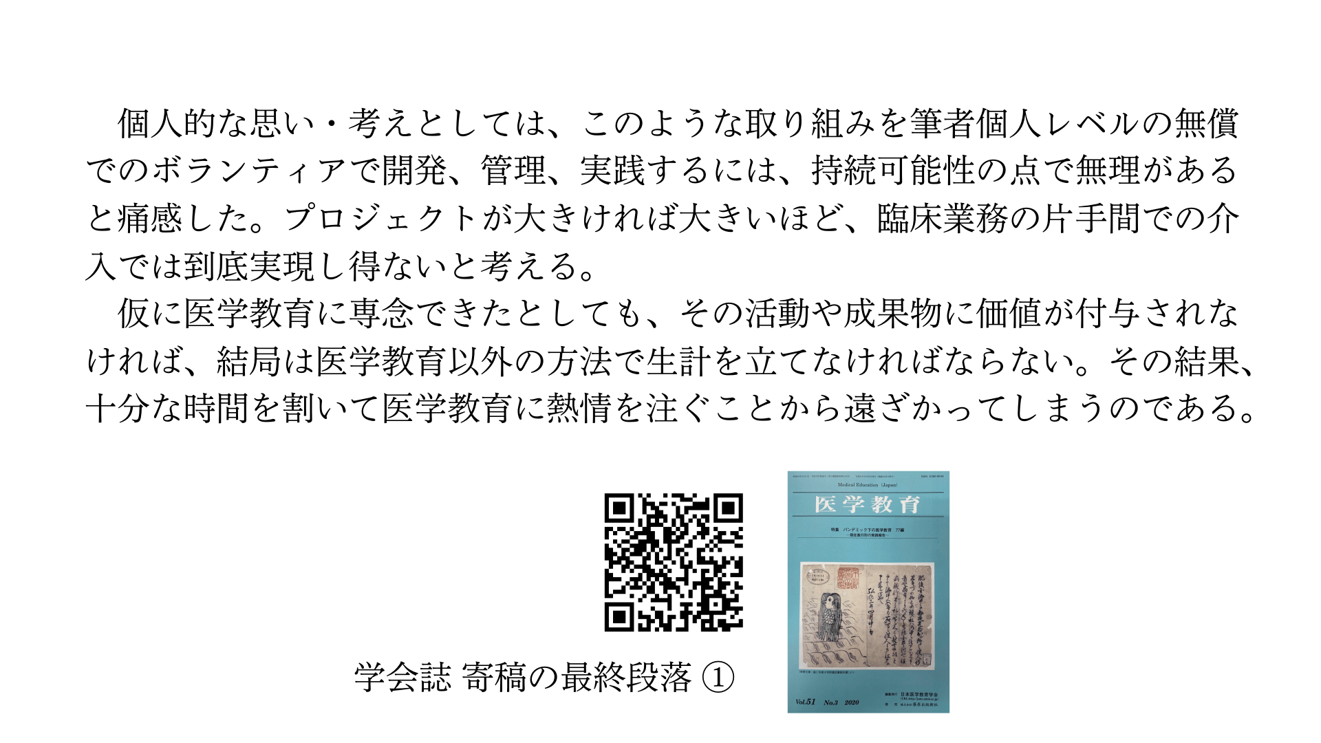#49. 個人的な思い・考えとしては、このような取り組みを筆者個人レベルの無償 でのボランティアで開発、管理、実践するには、持続可能性の点で無理がある と痛感した。プロジェクトが大きければ大きいほど、臨床業務の片手間での介 入では到底実現し得ないと考える。 仮に医学教育に専念できたとしても、その活動や成果物に価値が付与されな ければ、結局は医学教育以外の方法で生計を立てなければならない。その結果、 十分な時間を割いて医学教育に熱情を注ぐことから遠ざかってしまうのである。 学会誌 寄稿の最終段落 ①